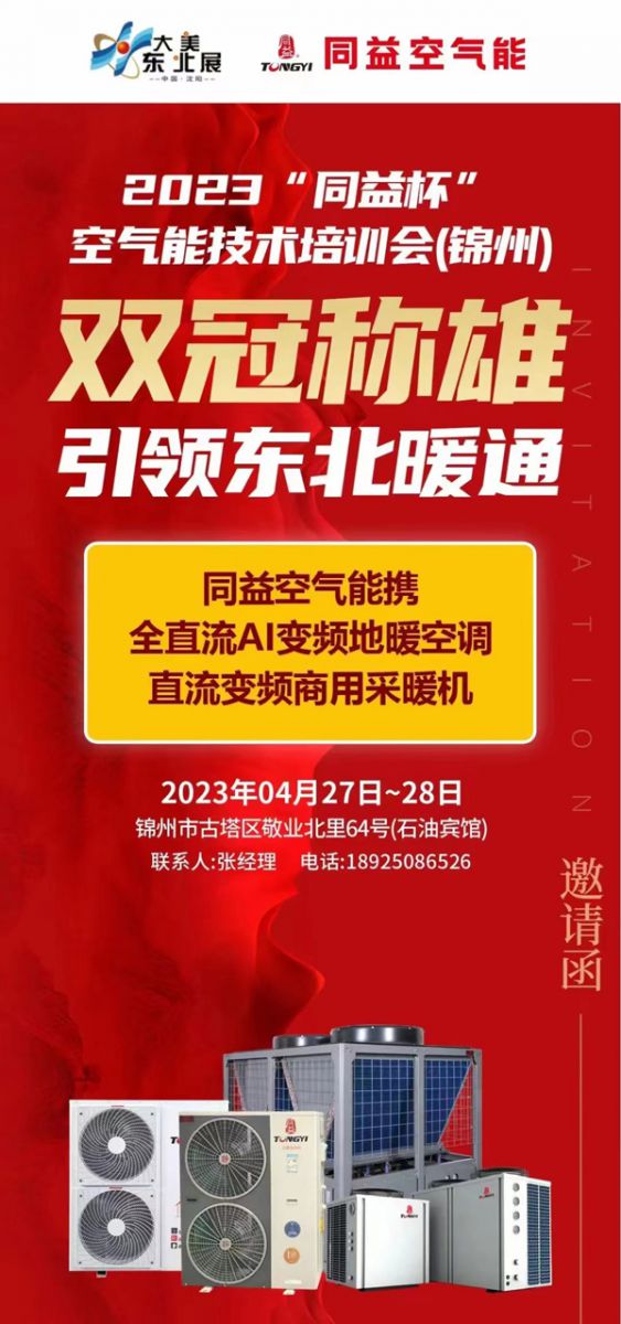 2023“同益杯”空氣能技術(shù)培訓會將于4月27日-28日在錦州市古塔區(qū)錦州石油賓館隆重啟幕!本次培訓會由同益空氣能獨家冠名,匯聚東北各地經(jīng)銷商齊聚錦州,共謀東北暖通行業(yè)千億市場!